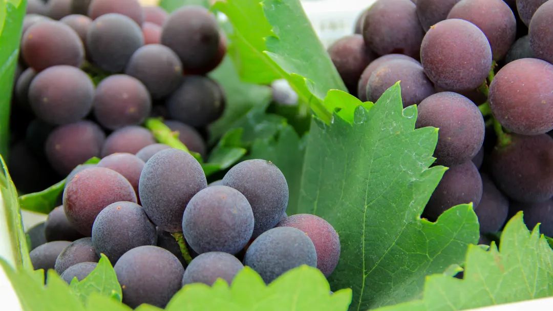 阳光的照射下,葡萄表面萦绕着柔和的阳光,看起来就像圆润的红宝石,好看极了!
